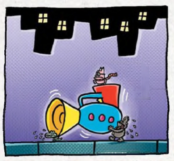 The FLEAS (Piggy, Crunky, and Bub) are walking on the sidewalk, searching for the shrink ray that made them small. They soon find it, and walk over to Petey's robot from book 5. The FLEAS shrink the robot, and Piggy climbs onto it evilly. The next morning, Li'l Petey, 80-HD, and Dog Man find 1 million dollars and 91 cents in their house. At first, they think it's from the tooth fairy, but on closer inspection, they realize that none of them have lost a tooth and decide to bring the money to the cops. Meanwhile, Sarah Hatoff reports that a bank was robbed last night, and the Mean Officers say they know who did it. At the same time, Dog Man, Li'l Petey, and 80-HD come in with the robbed money, and the cops arrest Dog Man with so-called "evidence." Li'l Petey and 80-HD try to stop the Mean Officers from taking Dog Man away, but Sarah restrains them. Li'l Petey and Sarah know that Dog Man is innocent, but they have to find another way if they were to prove his innocence.