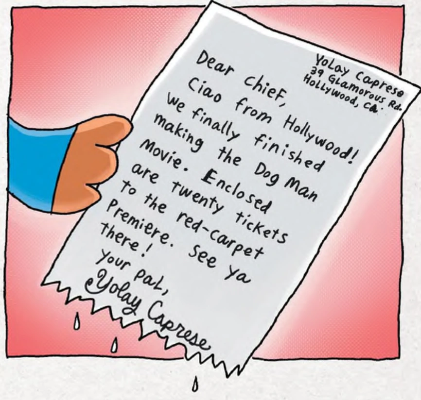 Dog Man and Chief are sleeping in the police station, when a delivery man comes in with a special delivery for Chief. Dog Man grabs the bottom of the envelope with his teeth and rips it off, much to Chief and Mean Officers' dismay. Chief then reads the letter, which is from Yolay Caprese and says that she has sent 20 tickets for each cop to the red carpet premiere of Dog Man: The Major Motion Picture. Chief looks for the tickets, but finds out that they were in the bottom of the envelope. Upon that realization, Dog Man swallows the bottom of the envelope with the tickets. Chief and the Mean Officers chase after him, screaming "DOG MAN!" Meanwhile, at Cat Jail, Big Jim enters Petey's cell and asks him what he is doing. Petey tells Big Jim that he is trying to be good, so he made a Good Chart to keep track of his progress. So far, Petey has been good for sixteen minutes. Big Jim expresses how proud he is for Petey and then tells him about a weird dream last night, which annoys Petey. Big Jim then sneezes out feathers onto Petey, which are from a pillow that he ate while dreaming last night because he thought it was a marshmallow. Petey loses his temper and shouts angrily at Big Jim to get out. Big Jim runs away crying, while Petey realizes that what he just did was bad, causing him to doubt himself and rip up his Good Chart. Petey texts Li'l Petey that he can't be good and that Li'l Petey would be better without him.