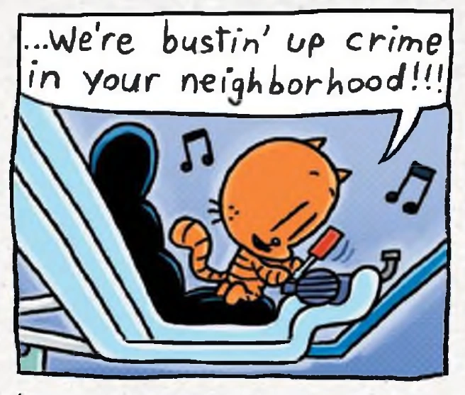Li'l Petey makes adjustments to his Kitty Scooter, making it into a Cat Hog while singing The Supa Buddies Theme Song. He then interacts with 80-HD, who finally completed building their new supa computer "Supa 'Puter". Li'l Petey checks Supa 'Puter, which informs him about a new message from Petey. Li'l Petey reads it and becomes shocked and worried, so he and 80-HD head out to visit Petey in Cat Jail. Meanwhile, Chief finishes his call with Yolay to get new tickets for the movie. Afterwards, Chief tells Dog Man that the movie is made in Claymation, and he'll teach him about it. Chief makes a little clay figure to demonstrate Claymation, but each one he makes keeps on vanishing mysteriously, causing Chief make a new one every time. Meanwhile, Petey is working on a new robot called the RoboBee. Li'l Petey arrives and asks him what's wrong. Petey says that he's a bad cat and that it's pointless for him to change. Li'l Petey tries to help him, but Petey orders 80-HD to take him home. Back at the police station, Chief tries to show Dog Man how to do Claymation for the eleventh time. Chief takes a picture and discovers that Dog Man has been eating the clay figures. Chief gets mad, and Dog Man responds by barfing out clay onto Chief. An outraged Chief orders Dog Man to get out. Dog Man runs into Li'l Petey and 80-HD as he exits the police station. Dog Man tells Li'l Petey how he had a sad day as well, and Li'l Petey reassures him that "at least things can't get any worse!" Little did he know what would happen in the next chapter.