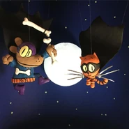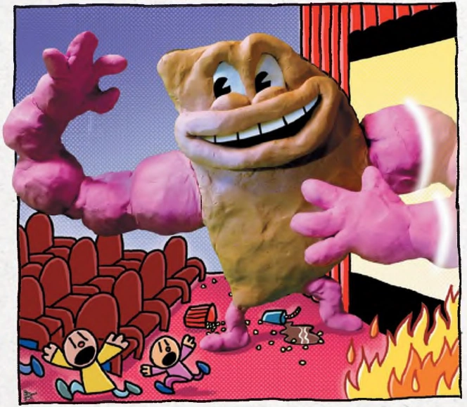 Sarah interrupts the beginning of this new chapter with a news report about everything going on at the cinema. Li'l Petey and Petey see the news and decide to jump into action, so they ride the RoboBee from Cat Jail to the cinema. They notice that Claymation Philly has a hold of Chief, so Petey zaps Claymation Philly's right leg with the RoboBee in order to save Chief. Dog Man catches Chief and Claymation Philly starts to fall off the roof. However, Claymation Philly notices the RoboBee and grabs it, taking down Petey and Li'l Petey with him. Li'l Petey calls out for 80-HD, and 80-HD saves him and Petey by cutting off Claymation Philly's right arm with big scissors. 80-HD takes Petey and Li'l Petey up onto the roof while Claymation Philly hits the ground. Dog Man, Chief, Li'l Petey, and 80-HD celebrate on the roof of the cinema until Sarah, Yolay, and Zuzu arrive. They tell them that there are still a buncha people trapped in the theater and that Claymation Philly is molto arrabiato (Italian for totally cheesed off). Li'l Petey replies: "This looks like a job for the Supa Buddies!" And so, Dog Man becomes The Bark Knight, Li'l Petey becomes Cat Kid, and 80-HD becomes Lightning Dude. Li'l Petey tells everyone to go save the people while he and Dog Man take care of Claymation Philly. Dog Man and Li'l Petey then jump off the roof to deal with Claymation Philly. Li'l Petey slices off Claymation Philly's left arm with ease. Dog Man uses his cape to land safely and catches Li'l Petey. But then, Claymation Philly gets supa angry and chases after Dog Man and Li'l Petey. Dog Man hides Li'l Petey under a bucket and runs into a cave. Claymation Philly follows Dog Man into the cave, causing the boulders on top of the entrance to fall and block the entrance. Li'l Petey walks up to the blocked cave entrance and hears munching sounds. Thinking that Claymation Philly ate up Dog Man, Li'l Petey cries out loud. 80-HD hears Li'l Petey's cries, heads over to the blocked cave entrance, and starts clearing the boulders away from the cave. All hope seemed lost at first, but as soon as the boulders were fully cleared away from the cave, it turned out that Dog Man was alive and that he ate up Claymation Philly. However, Dog Man was going to hurl. Li'l Petey then has an idea, so he and 80-HD carry Dog Man by his legs and fly him over to the theater. Dog Man then barfs the clay onto the cinema in order to put out the fire and save everyone. Everybody got soaked except for Sarah, who held up her umbrella. As soon as everyone was back safely on the ground, Sarah and Yolay noticed that the seven dogs from Dog Jail saved Dippy by pulling her out of the theater together. However, the Judge and the Guard got out of the hole and told the heroes that somebody's gotta pay for what happened at the cinema, so the Judge plans to see them all in his court, with the Guard being a witness against them. Luckily, the warden and his dogsled, who slid down from the mountain earlier, bonks into the Guard and the Judge, causing them to fall back into the hole. The warden then falls into the hole, along with the dog poo from the canister. The heroes celebrate once again and start walking back to Cat Jail.