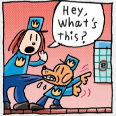 Meanwhile, Dog Man is chewing his bone at his cop cubicle until he gets a phone call from Sarah Hatoff saying the pet store crook didn't steal money. He only stole little treasure chests. Sarah was asking if Dog Man knows what the treasure chests were made of and he thinks they are made of wood, so he says "Bark!" but they were made out of plastic. And Sarah said that they just wrote a story on it on their news blog.